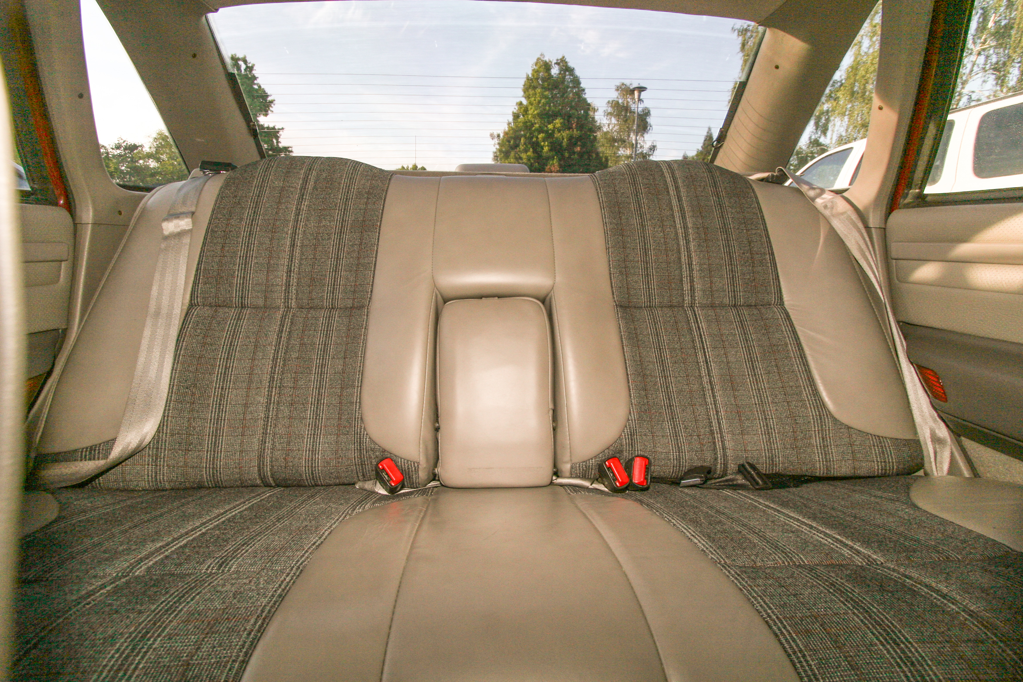 The middle seat belt is present but stuffed under the fold-out middle arm-rest.