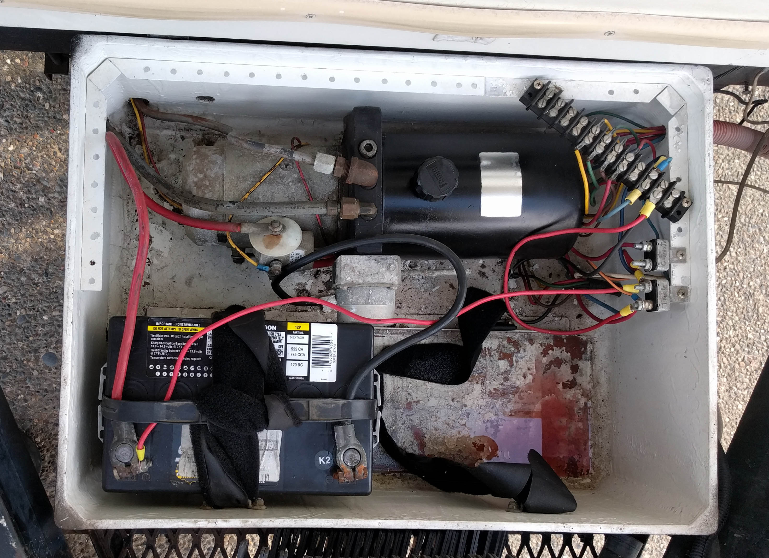 was down. Since this trailer has no manual option to raise the top, he needed a way to get to the battery for charging. The box contains the hydraulic pump unit