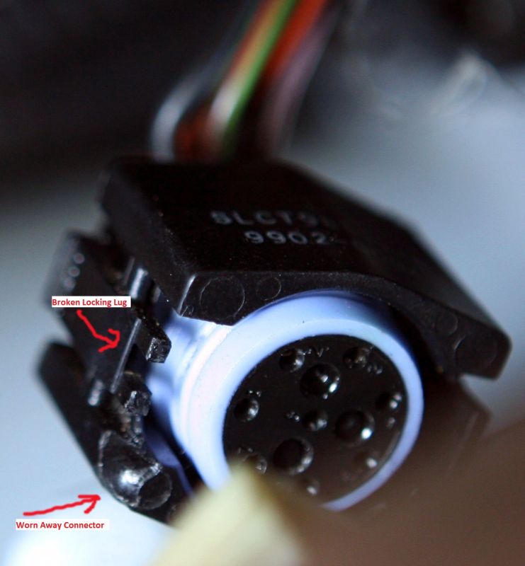 Below: The lower left corner or the harness connector tells the story - the corner has been worn away and the locking clip is broken.