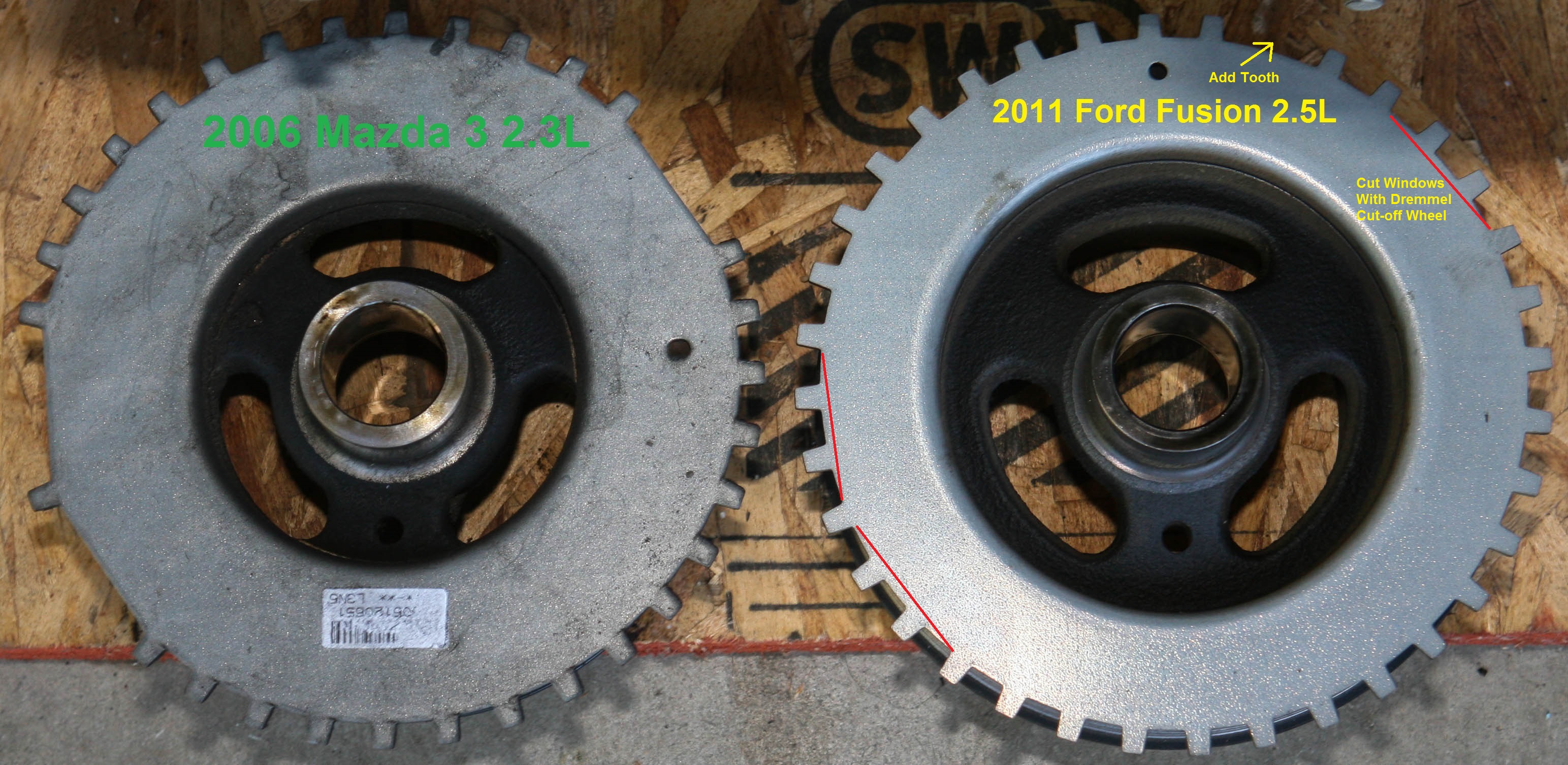 pulley trigger wheel (tone wheel) to interoperate with the 2006 Mazda 3 2.3L PCM. I used a dremmel tool,