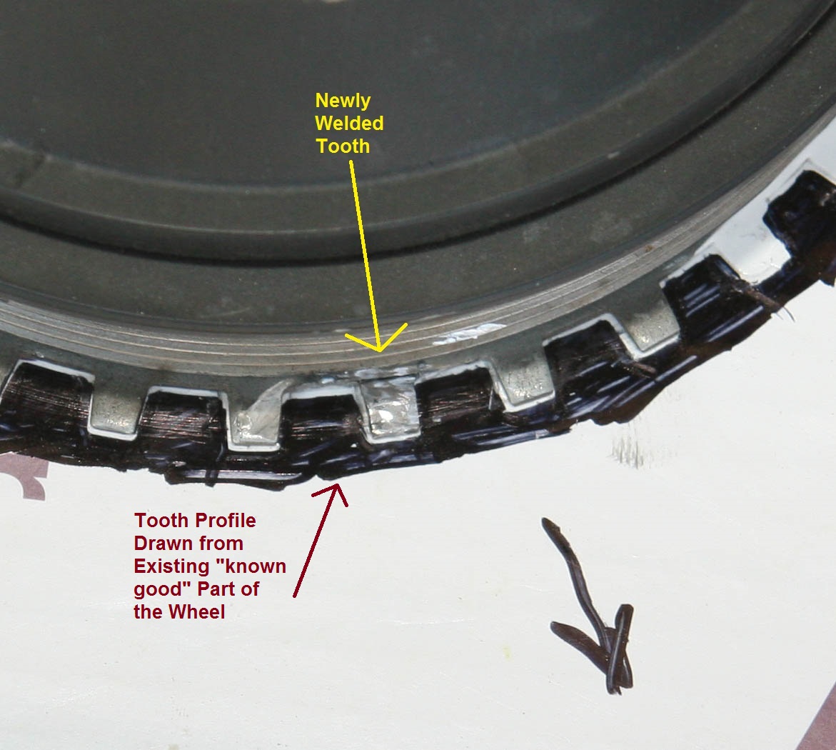 The old teeth were used as a jig for welding on a new tooth. I used a binder clip to clip a single tooth to a pair of cut off teeth and the used another binder clip to