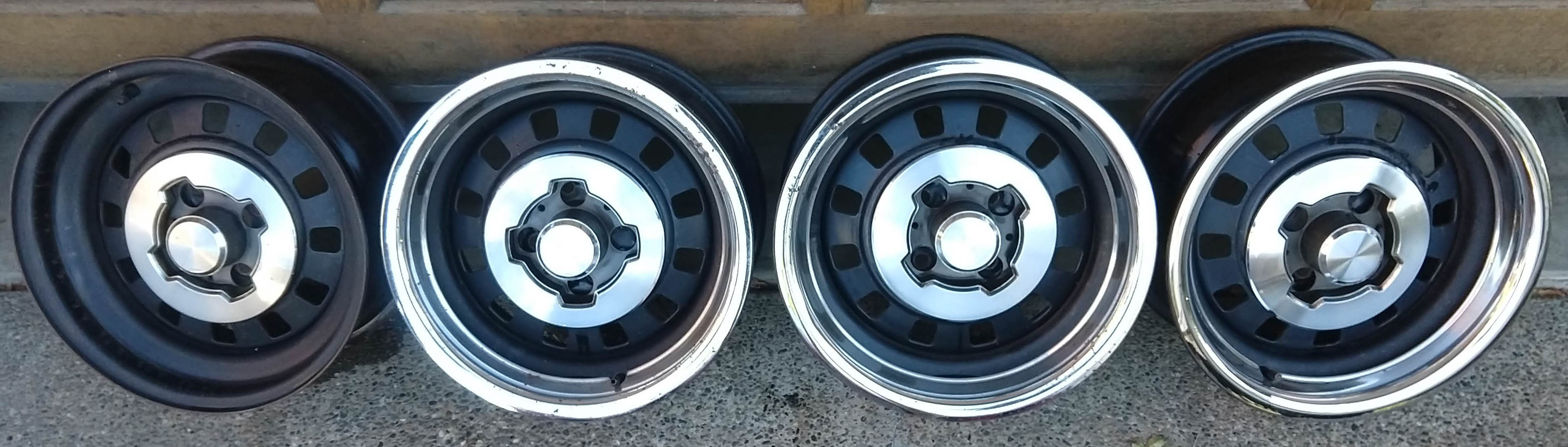 with chrome trim rings and plastic center caps. When I used to see the CHP vehicles on the road, I saw them without the chrome trim rings. I