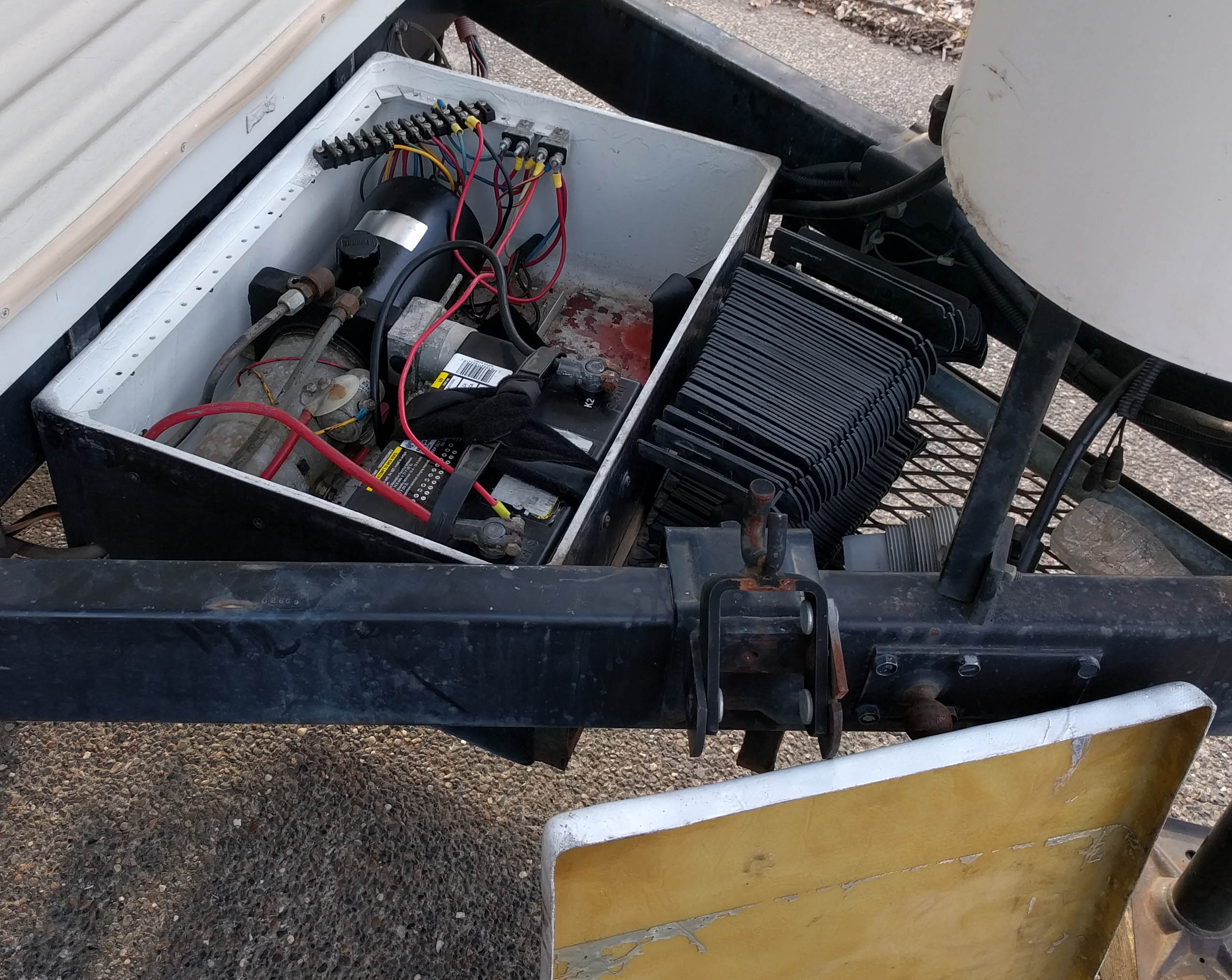 was down. Since this trailer has no manual option to raise the top, he needed a way to get to the battery for charging. The box contains the hydraulic pump unit