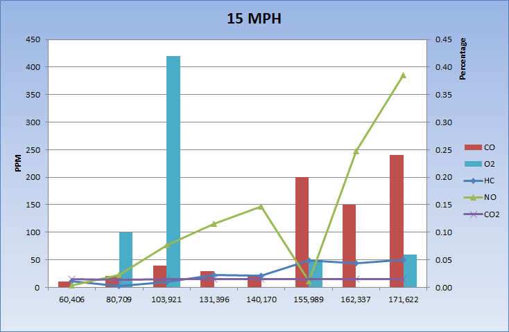 | Date | Result | Mileage | Cost | RPM | MPH | Max HC |